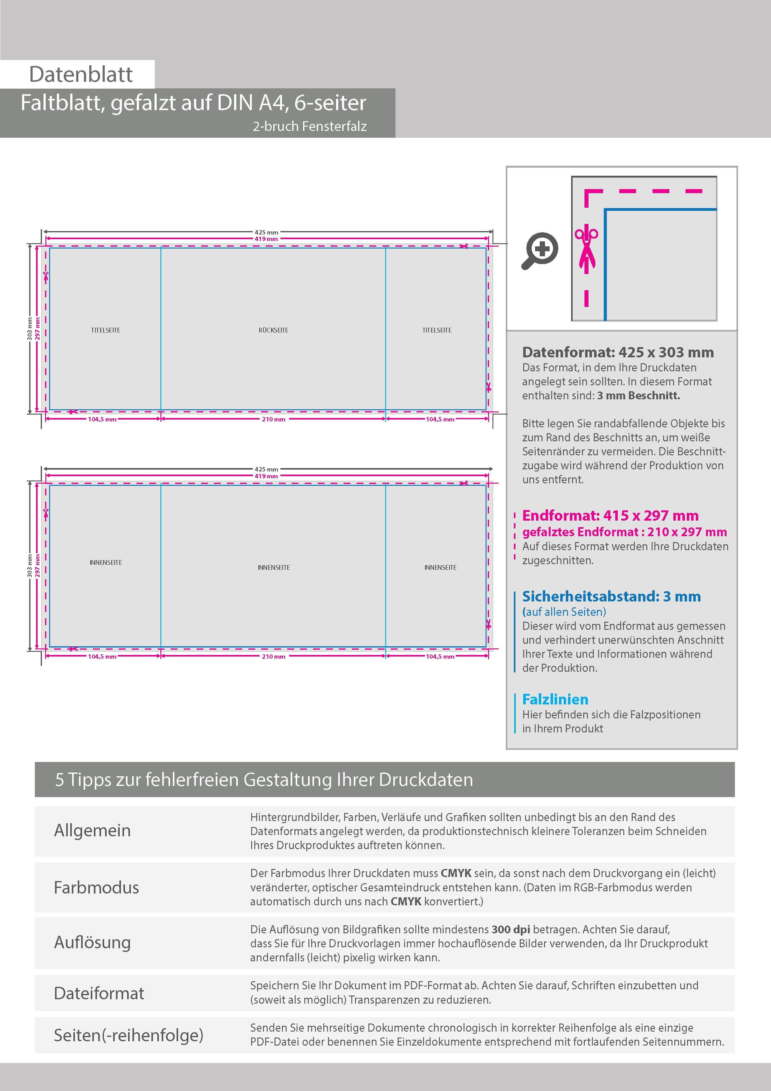 Faltblatt, gefalzt auf DIN A4, 6-seiter (2-bruch Fensterfalz)