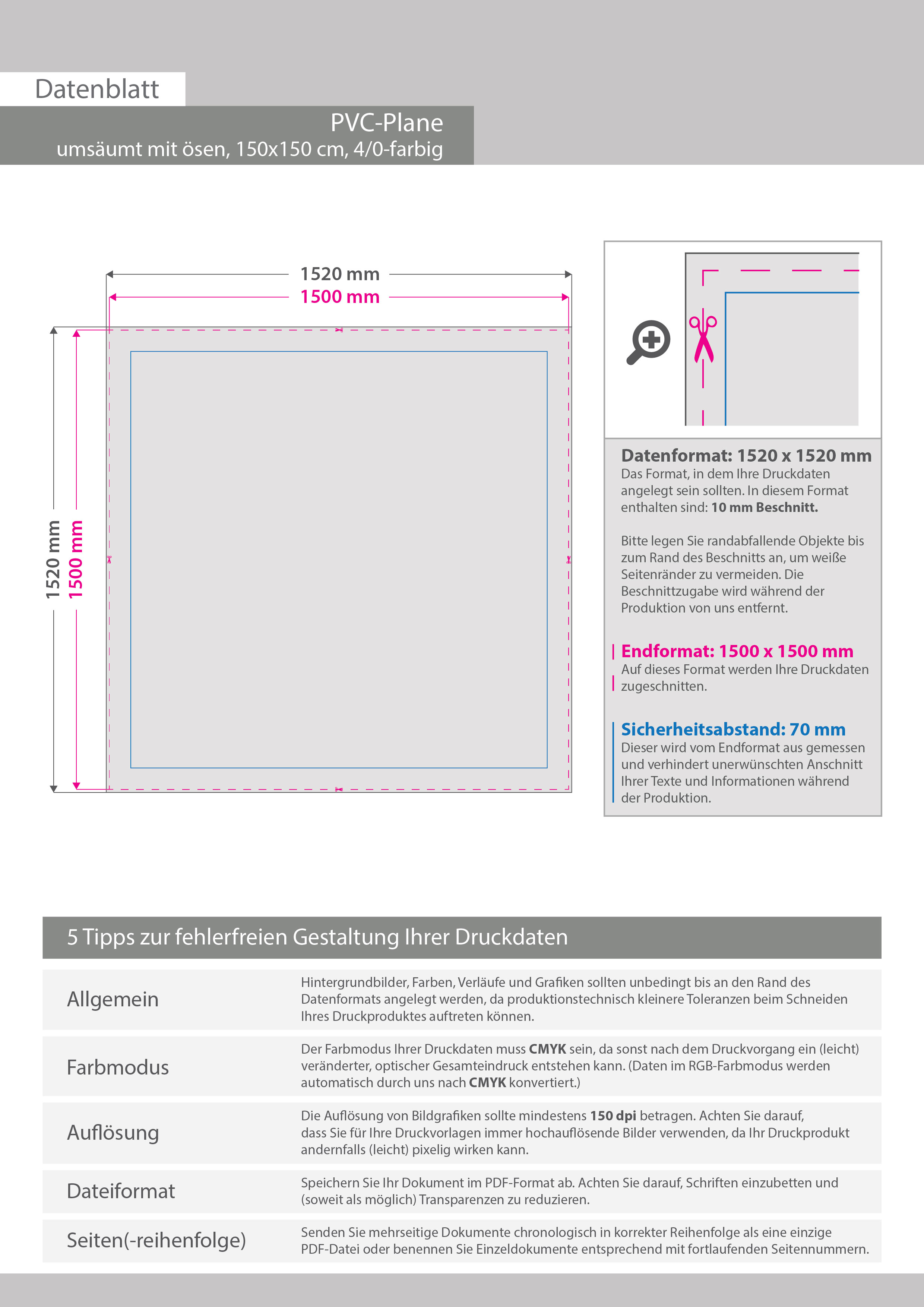 Hochwertige PVC-Plane 150 x 150 cm, 4/0-farbig bedruckt, Umsäumt + Ösen im Abstand von 50 cm oben und unten