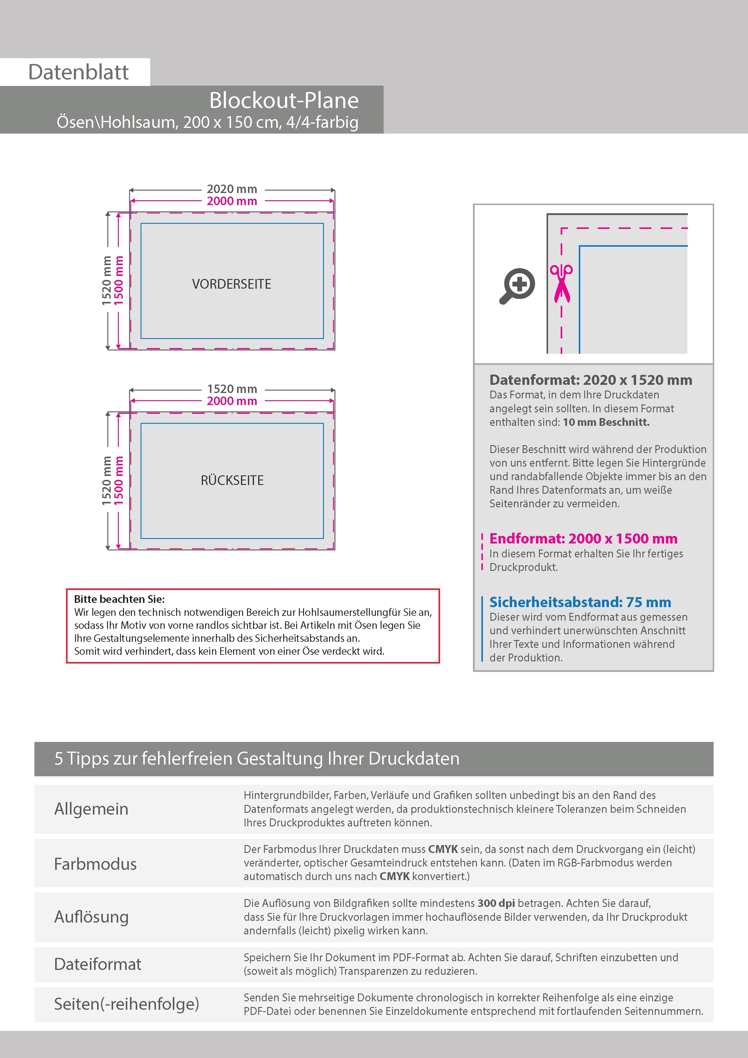 Hochwertige Blockout-Plane 200 x 150 cm, 4/4-farbig bedruckt, Ösen im Abstand von 50 cm links und rechts
