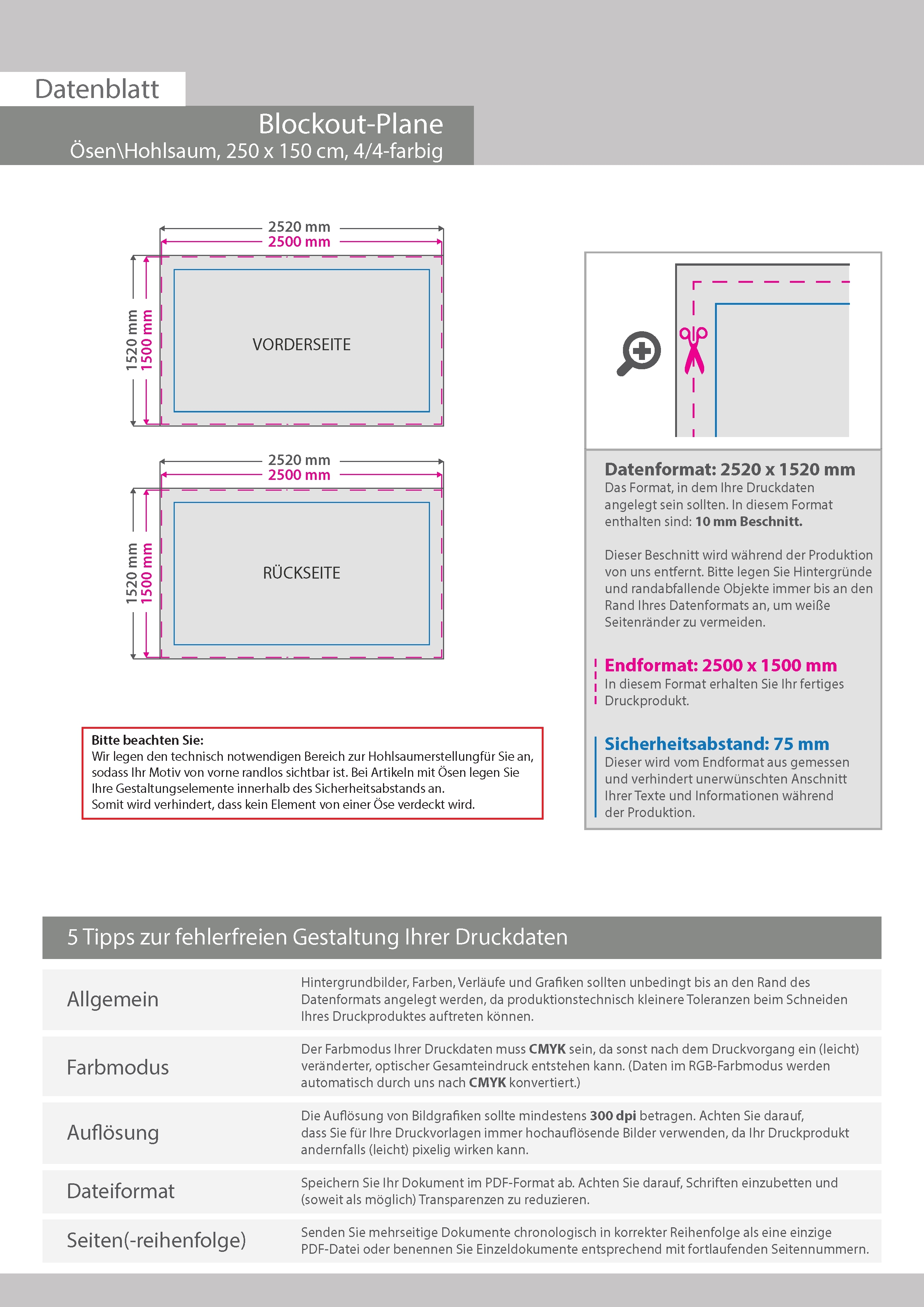Hochwertige Blockout-Plane 250 x 150 cm, 4/4-farbig bedruckt, Ösen im Abstand von 50 cm links und rechts
