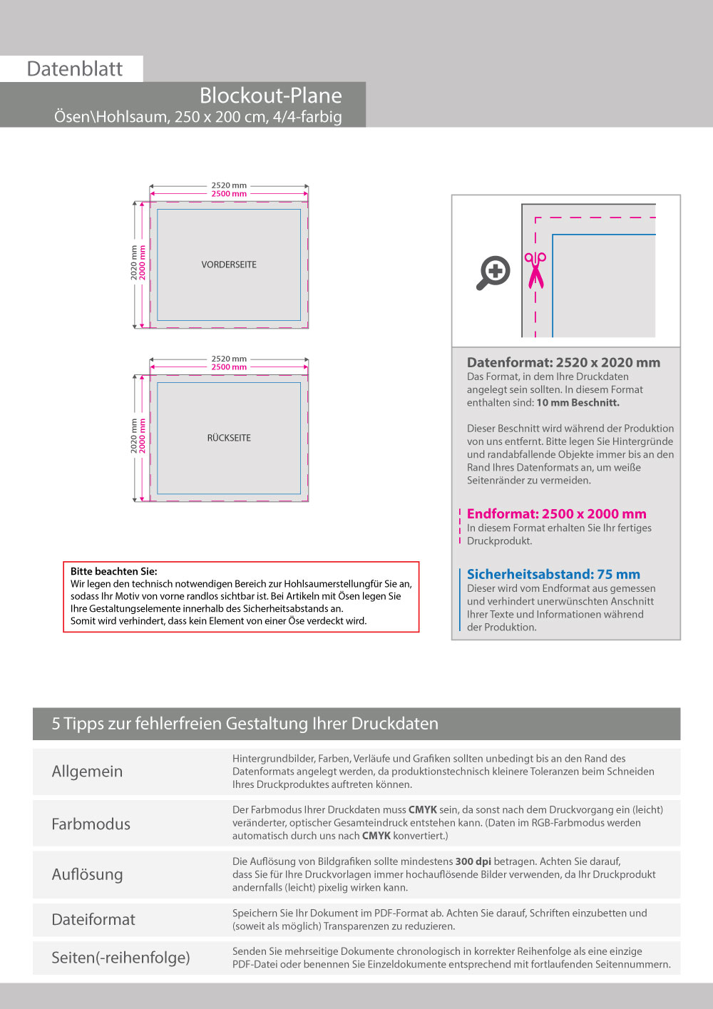 Hochwertige Blockout-Plane 250 x 200 cm, 4/4-farbig bedruckt, Ösen im Abstand von 50 cm links und rechts