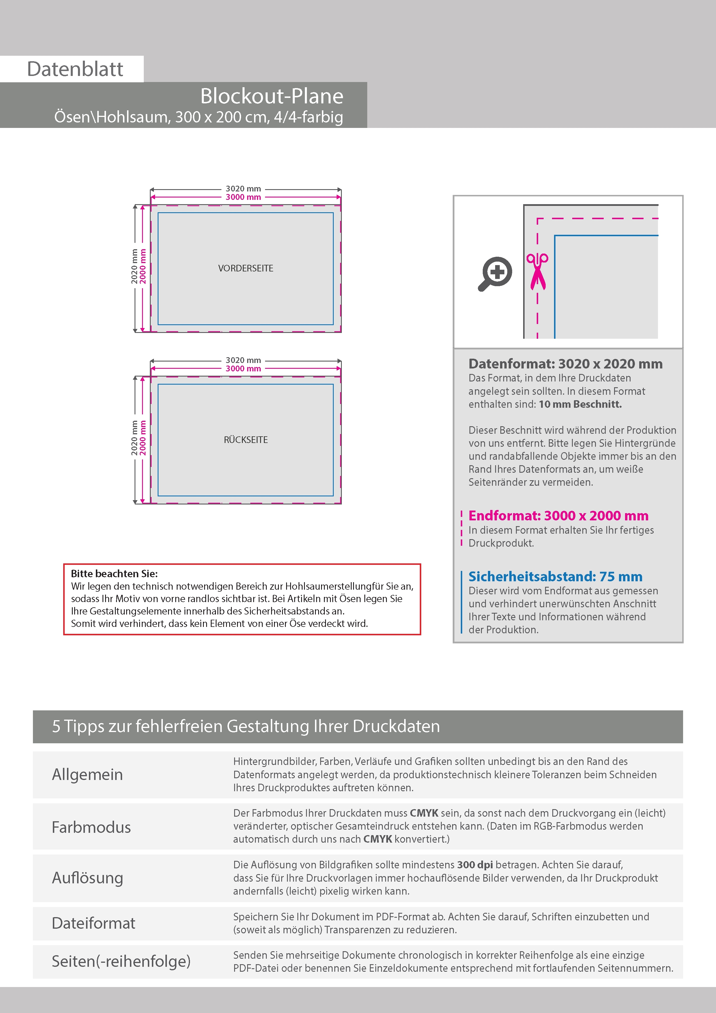 Hochwertige Blockout-Plane 300 x 200 cm, 4/4-farbig bedruckt, Ösen im Abstand von 50 cm links und rechts