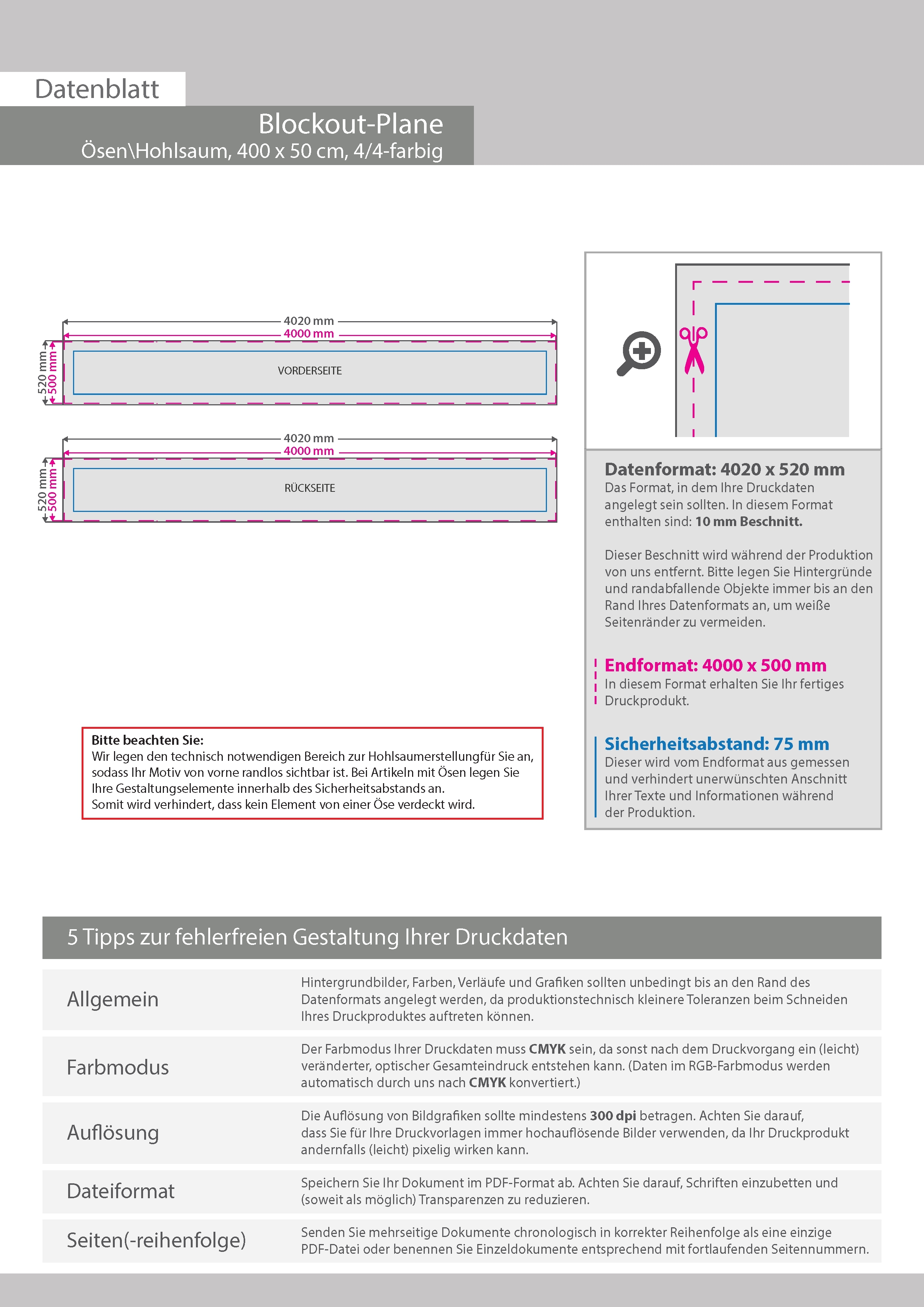 Hochwertige Blockout-Plane 400 x 50 cm, 4/4-farbig bedruckt, Ösen im Abstand von 50 cm links und rechts
