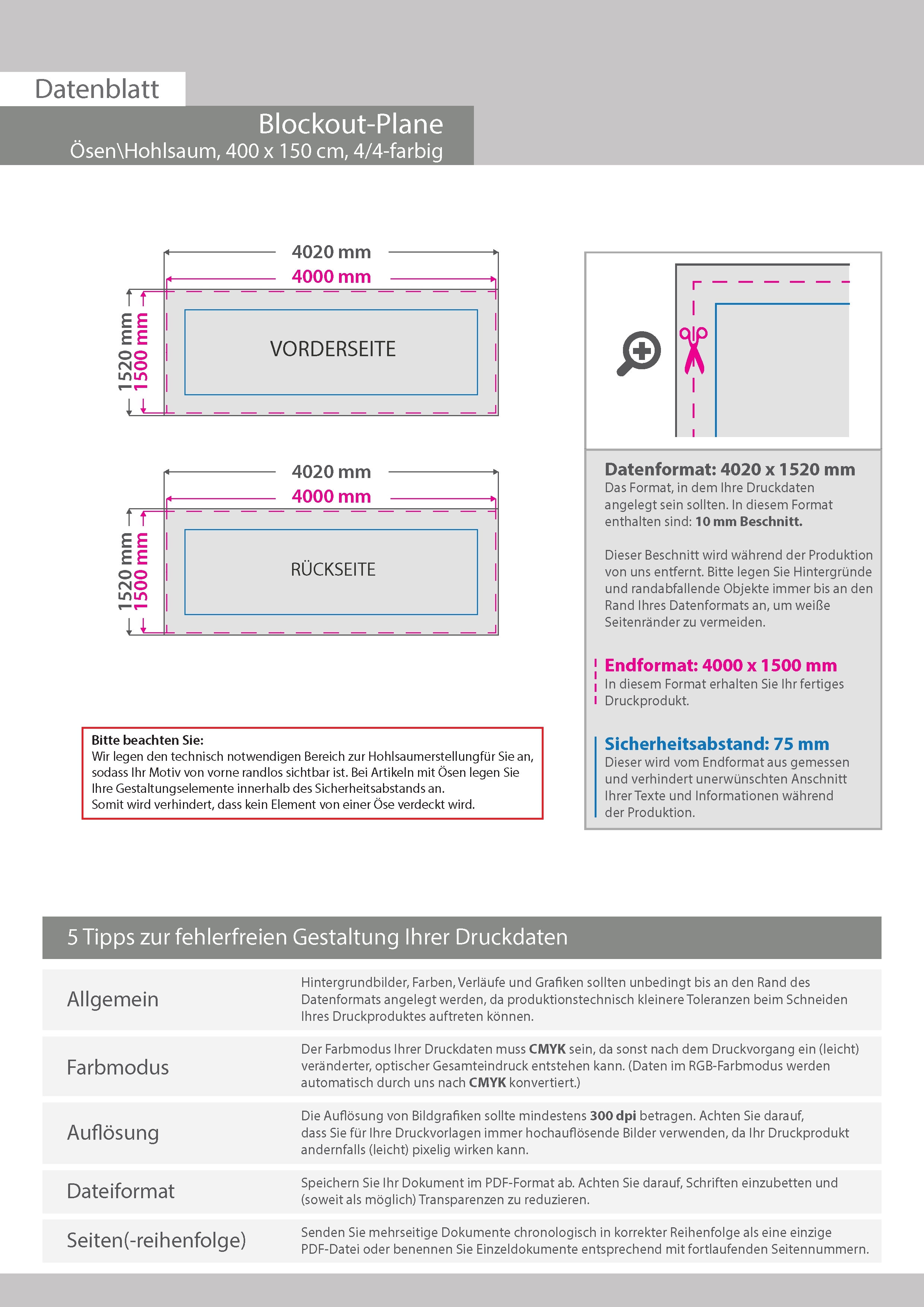 Hochwertige Blockout-Plane 400 x 150 cm, 4/4-farbig bedruckt, Ösen im Abstand von 50 cm links und rechts