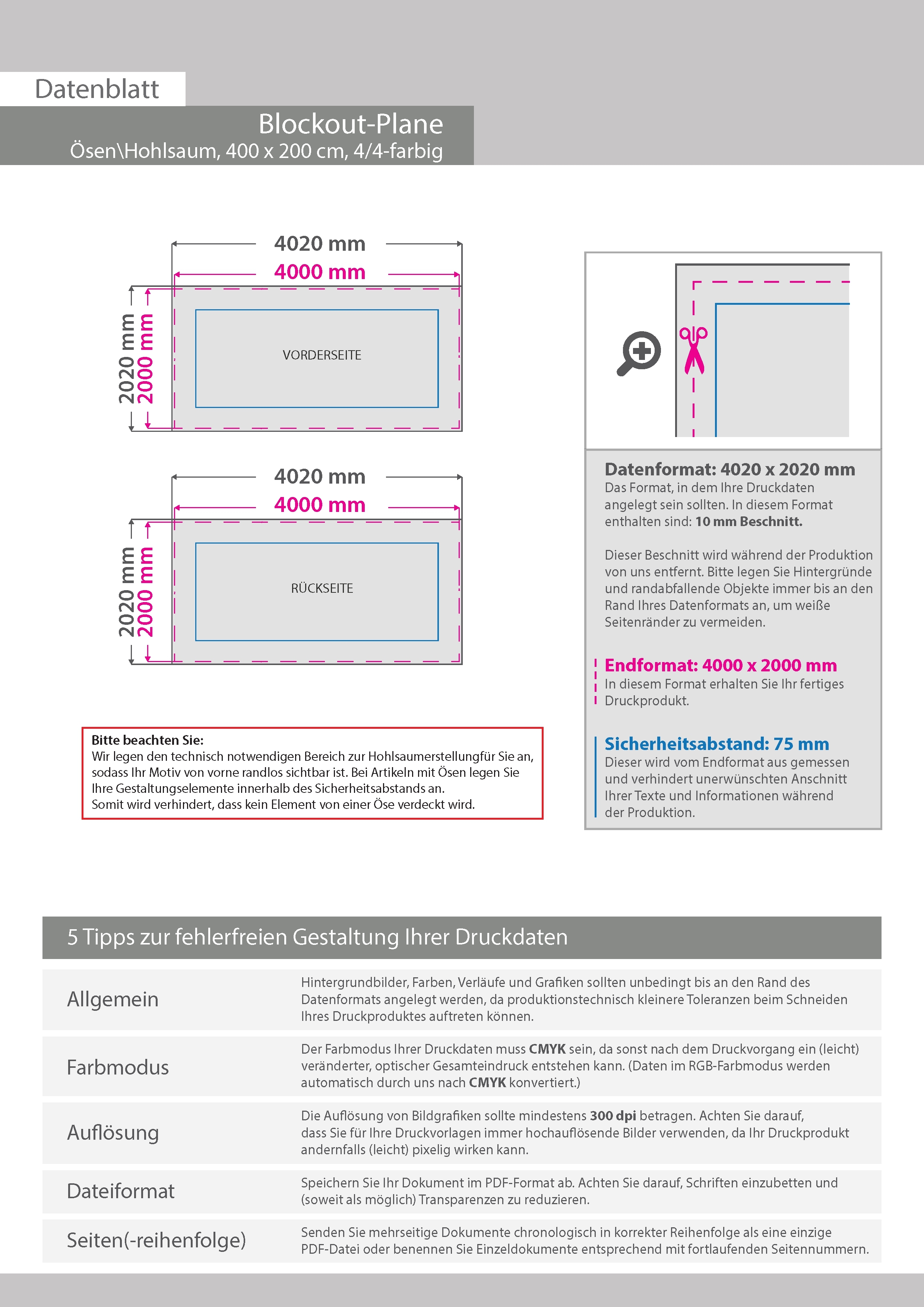 Hochwertige Blockout-Plane 400 x 200 cm, 4/4-farbig bedruckt, Ösen im Abstand von 50 cm links und rechts