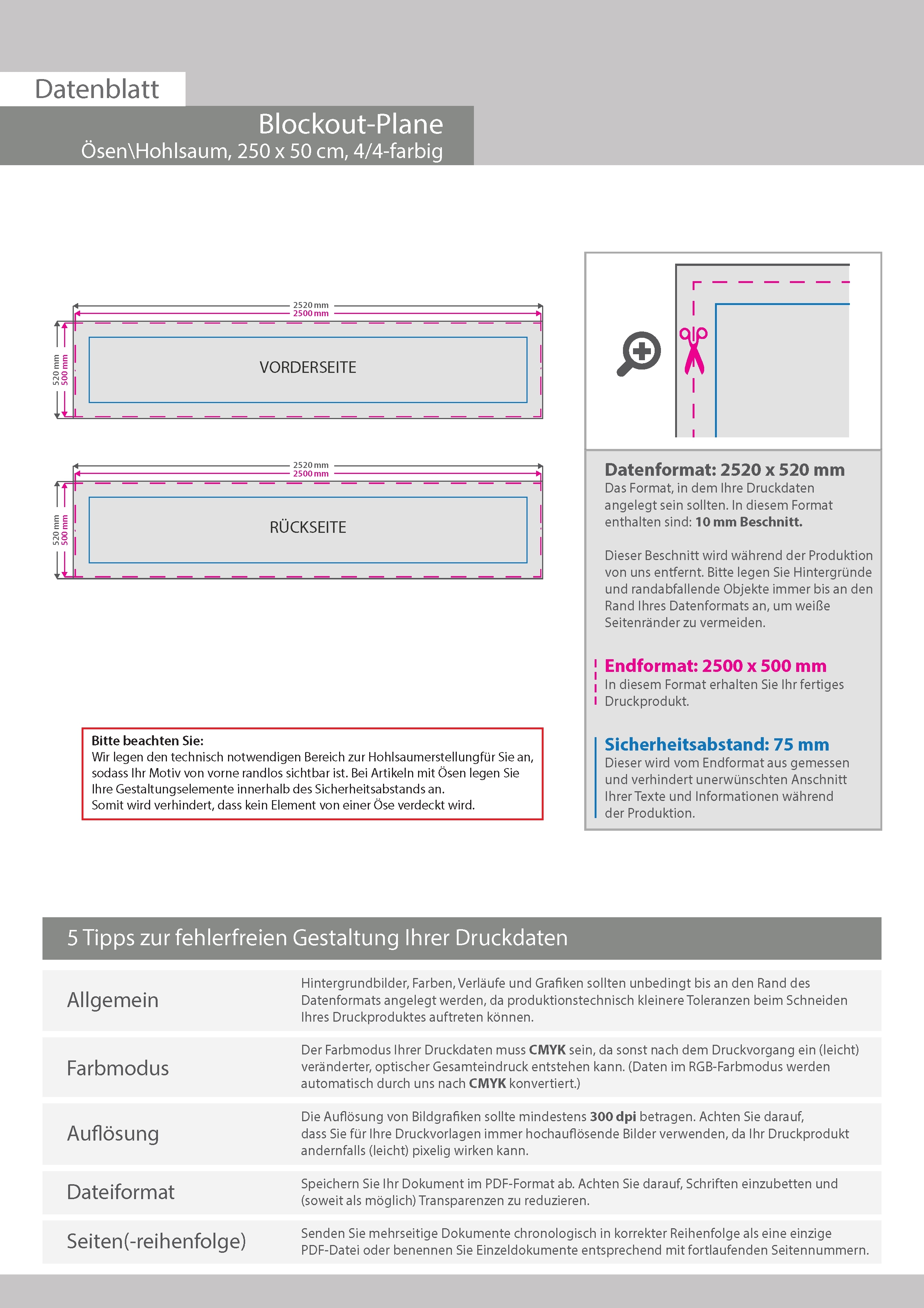 Hochwertige Blockout-Plane 250 x 50 cm, 4/4-farbig bedruckt, Hohlsaum oben und unten (Durchmesser Hohlsaum 3,0 cm)