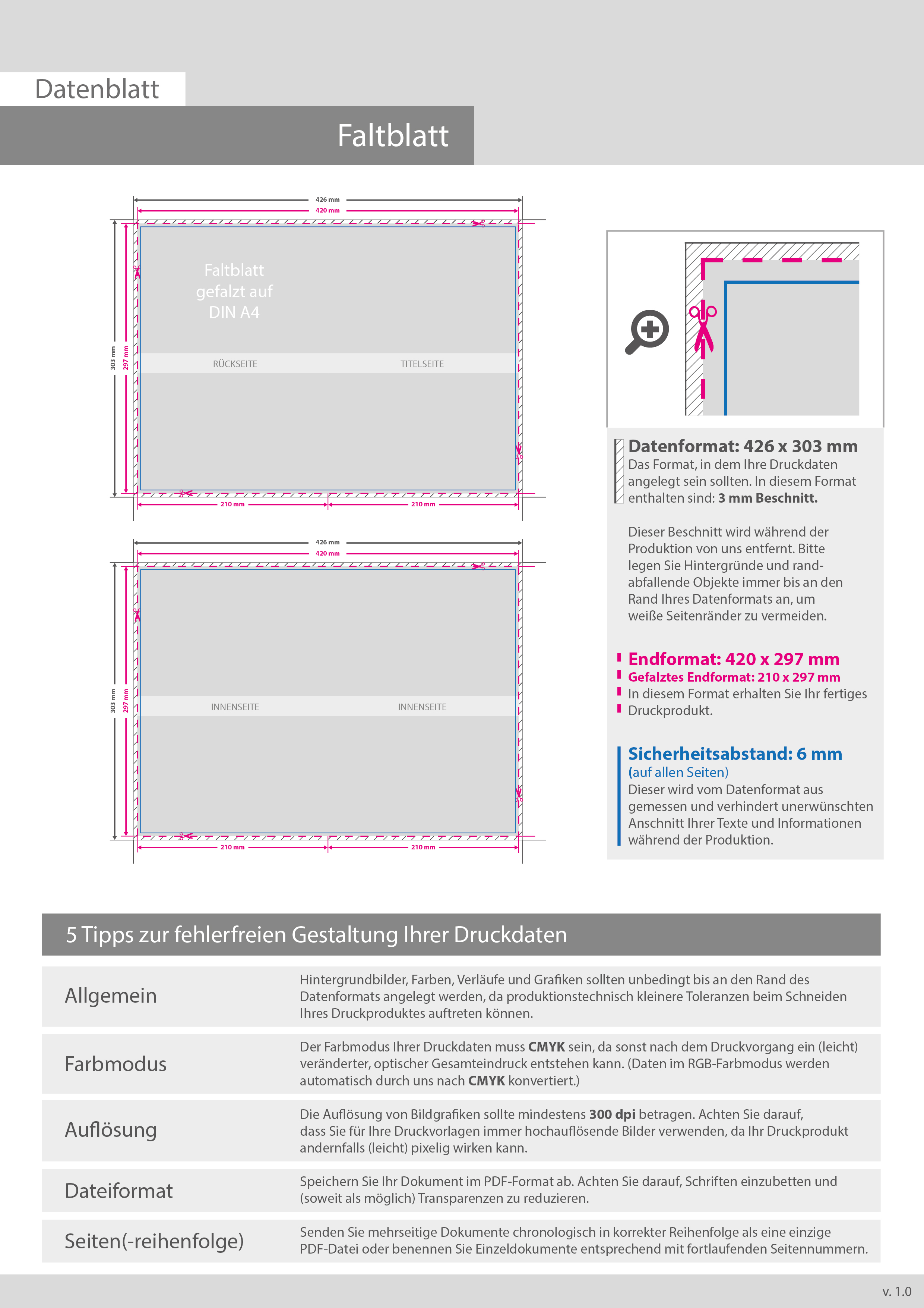 Faltblatt, gefalzt auf DIN A4, vertikaler Mittelfalz, 4-seitig